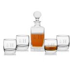 Heavy-weighted square decanter and four round glasses, a glass domed topper, and free personalization. -