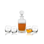 This set features a square glass decanter, and the tipsy whiskey glasses. The tipsy whiskey glasses are both practical and playful. The swirling rotation of these personalized rocks glasses, allows for oxygenation of your spirit without spilling, while also adding a unique feature to your whiskey glass collection. Free personalization always!