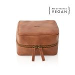 Brown vegan leather construction, one open pouch, three elastic bands, Argyle lining, antique gold zipper. -