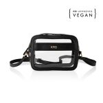Stadium approved clear plastic construction, vegan leather detailing, adjustable strap -