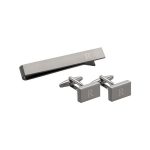 A simple rectangle tie clip with a slide-on bar design for the back and a classic T-back closure cufflink in a rectangle shape, both complete in a gunmetal finish. -